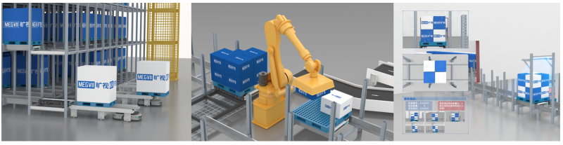?曠視四向車+拆碼垛機器人:四向車托盤存儲+機械臂拆碼垛,實現全無人化整箱揀選;使用同一個機械臂進行拆垛和混合碼垛,直接完成出庫托盤聚合;夜間可用機械臂進行同SKU的托盤合并,提高空間利用率。