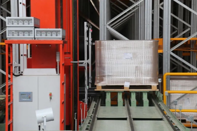 存儲貨架區配備了18臺雙立柱堆垛機,其負載可達1650公斤,水平運行速度可達120m/min,垂直速度可達30m/min。輸送至巷道口的托盤就會由堆垛機運送至對應的貨位上完成存儲。