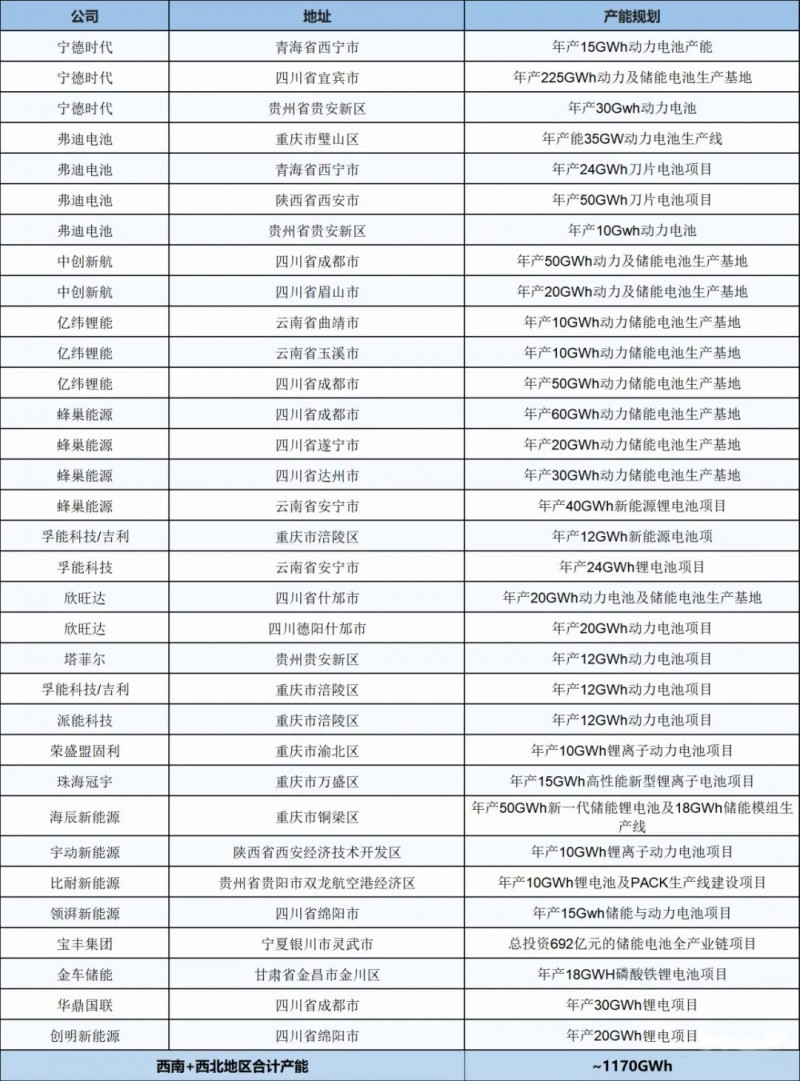 全國動力與儲能電池基地產能統計表4---西南+西北地區