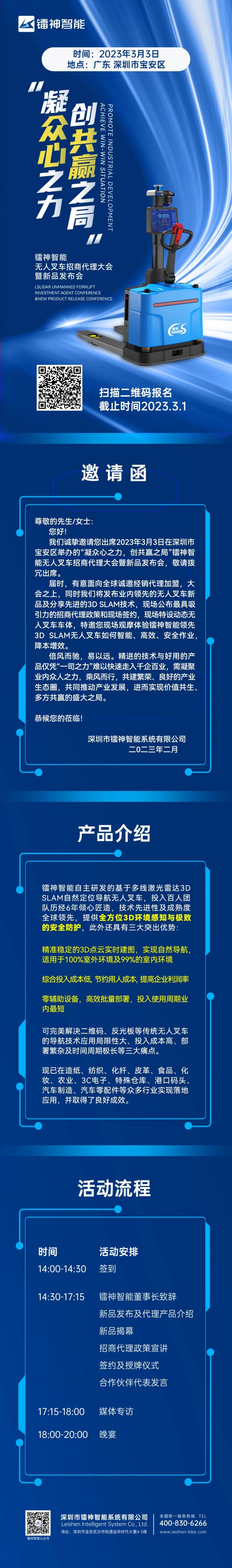 鐳神智能無(wú)人叉車(chē)招商代理大會(huì)暨新品發(fā)布會(huì)即將開(kāi)幕!