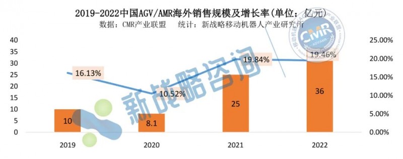 2019-2022中國AGV/AMR海外銷售規模及增長率(單位:億元)