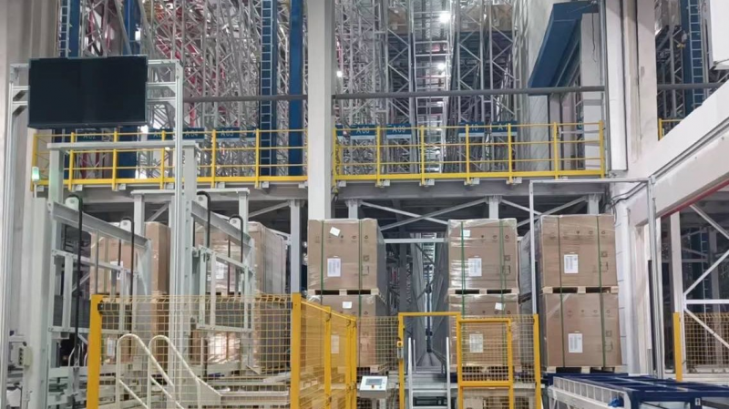 立庫占地1.8萬平米配備14000多個托盤貨位,能夠存儲27000多箱貨品。在該項目中,曠視機器人通過智慧物流軟件平臺“曠視河圖”,集成15臺高20多米單元載荷3噸的雙立柱雙深位堆垛機、450余臺輸送機,以及若干疊托機、打帶機、RGV等核心設備,實現從成品光伏組件下線后的自動供給母托盤、合托、打帶入庫,以及成品發貨出庫,并兼容反向物流。