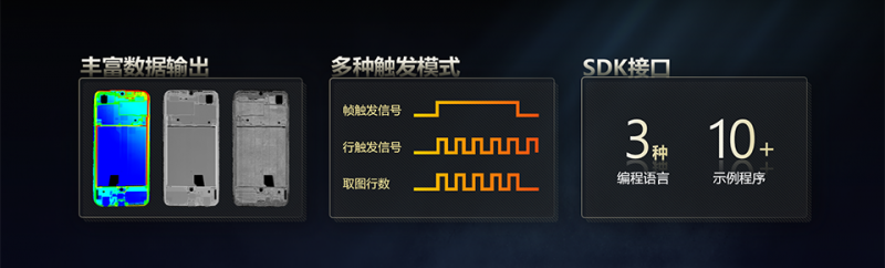 相機對外提供豐富的數據接口,包括輪廓數據、點云數據、深度圖、亮度圖。同時兼容多種觸發模式,支持差分編碼器觸發輸入,支行觸發、幀觸發,行+幀觸發的應用模式。通過SDK集成激光輪廓傳感器到第三方軟件框架,提供C、C#、Python三種語言版本的SDK,包括主流視覺分析軟件在內的10多種集成使用示例,便于用戶的二次開發。