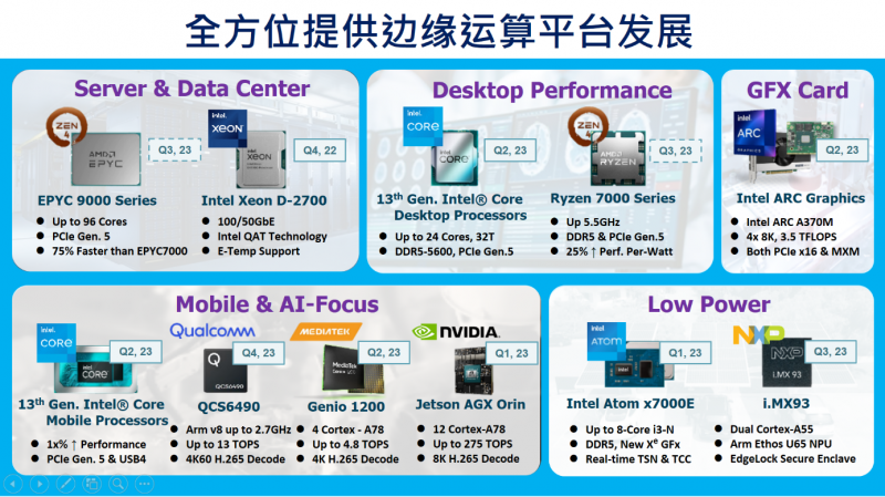 張家豪認(rèn)為目前邊緣運算有兩大發(fā)展方向:第一是往高效能發(fā)展,強調(diào)High performance computing(HPEC);第二是往Edge AI發(fā)展,研華在Embedded Design-in的核心競爭力除了積累多年的實戰(zhàn)經(jīng)驗之外,還可為客戶提供一系列的R&D服務(wù)、技術(shù)設(shè)計服務(wù),包括軟件和硬件。相比傳統(tǒng)的嵌入式計算,研華看到了從低功耗、標(biāo)準(zhǔn)通用型平臺到邊緣運算的轉(zhuǎn)變。因此,研華非常重視產(chǎn)品的高效能發(fā)展,特別是在HPEC架構(gòu)下。此外,研華也看到了AI技術(shù)對于邊緣運算產(chǎn)業(yè)和嵌入式電腦產(chǎn)業(yè)的趨勢,因此他們正在努力將AI技術(shù)導(dǎo)入,形成Edge AI平臺。