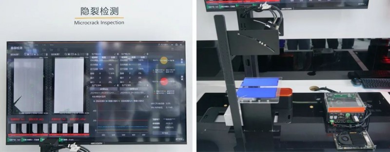 其中,隱裂檢測方案使用“4k黑白線陣相機+大靶面短波紅外鏡頭+穿透式近紅外線激光光源”,可對0.5mm以上尺寸的脫晶、崩邊、破片、隱裂以及疊片、臟污進行檢出與分類;在數(shù)據(jù)處理上,采用了新發(fā)布的SVA智能視覺處理卡方案,將軟件的大部分傳統(tǒng)算法與深度學習檢測模塊轉(zhuǎn)入這張采集卡內(nèi)工作,極大降低了工控機的硬件資源占用。