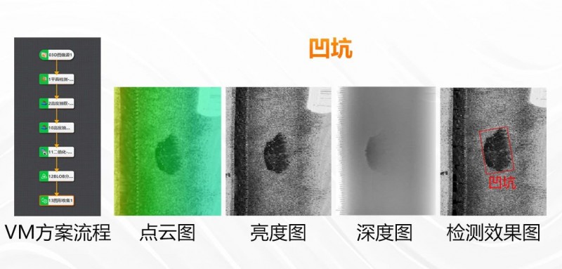 3D激光輪廓傳感器可有效識(shí)別缺陷、同時(shí)滿(mǎn)足生產(chǎn)節(jié)拍要求,完成全面檢測(cè)僅需旋轉(zhuǎn)一周。如下展示了鼓包、凹坑的實(shí)際測(cè)試圖像。
