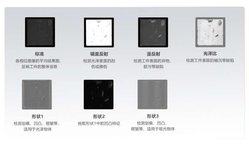 傳統(tǒng)檢測方案往往需要針對不同缺陷定制專用設備,不僅成本高昂,而且標準化程度低。而2.5D視覺技術則大為不同,它僅需單個光源就能同時檢測多種類型的缺陷,且不受角度限制,這大大提升了方案的通用性和效率。更重要的是,一次拍攝就能輸出多類型的結果圖,從細小的凹凸到復雜的劃痕,再到微小的臟污,展現了強大的復合檢測功能。