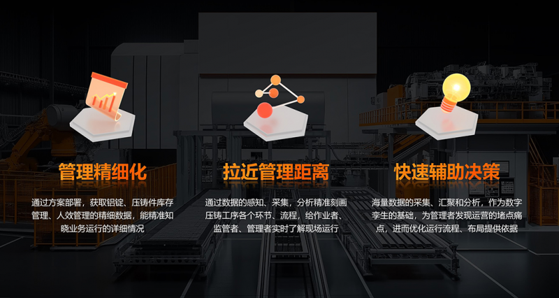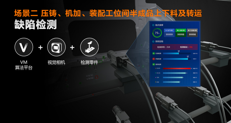 壓鑄過(guò)程場(chǎng)景解決方案,包括前處理下線工位與后處理上線工位、機(jī)加下線工位與裝配上線工位、缺陷檢測(cè)。