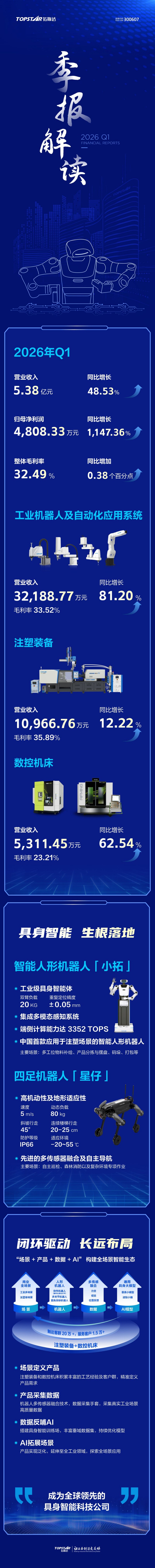 財報顯示,今年Q1拓斯達實現營收5.38億元,同比增長48.53%;歸母凈利潤為4808.33萬元,較上年同期的385.5萬元大增1147.36%,環比2025Q4增長95%;扣非凈利潤為3652.30萬元,同比增長2661.37%。