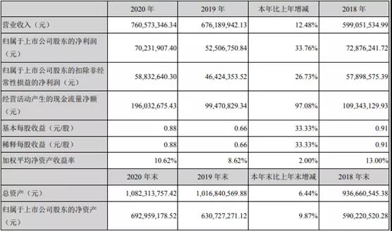 據(jù)寧波中大力德智能傳動(dòng)股份有限公司發(fā)布的2020年年度報(bào)告顯示,公司2020年度實(shí)現(xiàn)營(yíng)業(yè)收入 7.61億元,同比增長(zhǎng)12.48%;歸屬于上市公司股東的凈利潤(rùn)7023.19萬(wàn)元,同比增長(zhǎng)33.76%,扣除非歸母凈利潤(rùn)為5883萬(wàn),同比增長(zhǎng)26.73%。