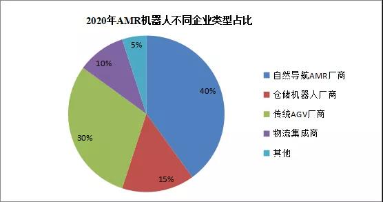 從企業(yè)數(shù)量上來看,目前AMR市場中,有40%是專注于這一細(xì)分領(lǐng)域的企業(yè),其次是傳統(tǒng)機(jī)器人廠商,占比30%,再是倉儲機(jī)器人廠商及物流集成商等。傳統(tǒng)AGV廠商和倉儲機(jī)器人企業(yè)對自然導(dǎo)航AGV/AMR市場頗為關(guān)注。