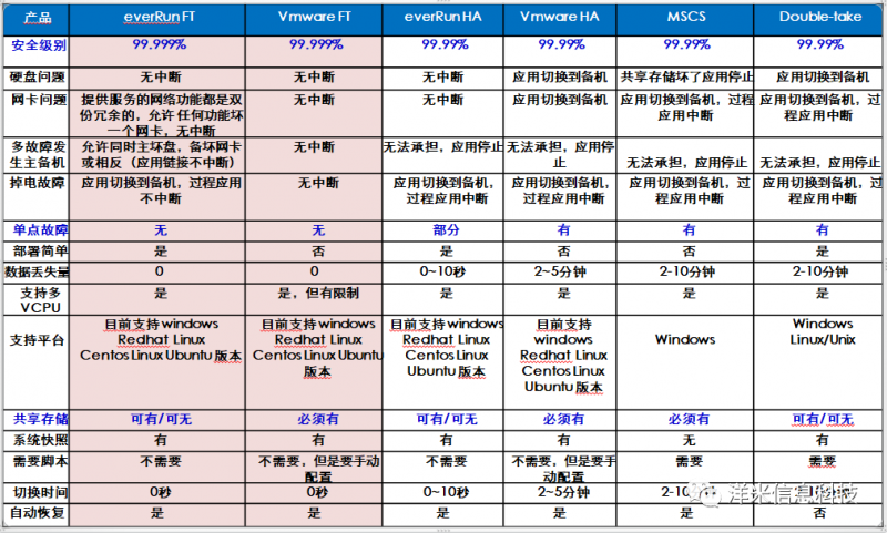 業(yè)界支持FT功能的有2家,為everRun FT和Vmware FT,從產(chǎn)品功能和成本分析考量,everRun更優(yōu);目前,業(yè)界無第三家支持FT功能的軟件,如下圖中MSCS,Double-take,均只支持HA功能,即業(yè)務(wù)會中斷,根據(jù)多方對比該科技有限公司選擇了洋米everRun Enterprise系統(tǒng)軟件,以下是對比圖: