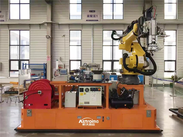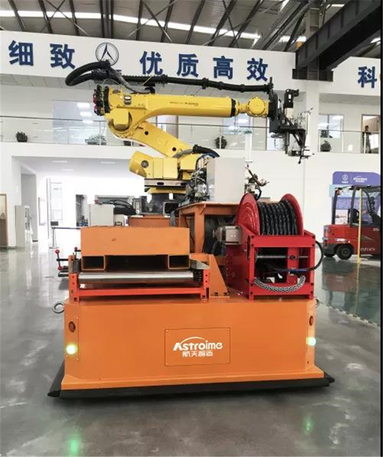 航天智造打造復合型重載AGV適用于風電行業(yè)葉片根部雙頭螺栓的安裝與檢測,實現(xiàn)了葉片自動識別型號、自動夾取螺栓、自動進行O型橡膠密封圈安裝和涂抹螺紋膠、擰緊作業(yè)、設備扭矩數(shù)據(jù)互通等智能化。