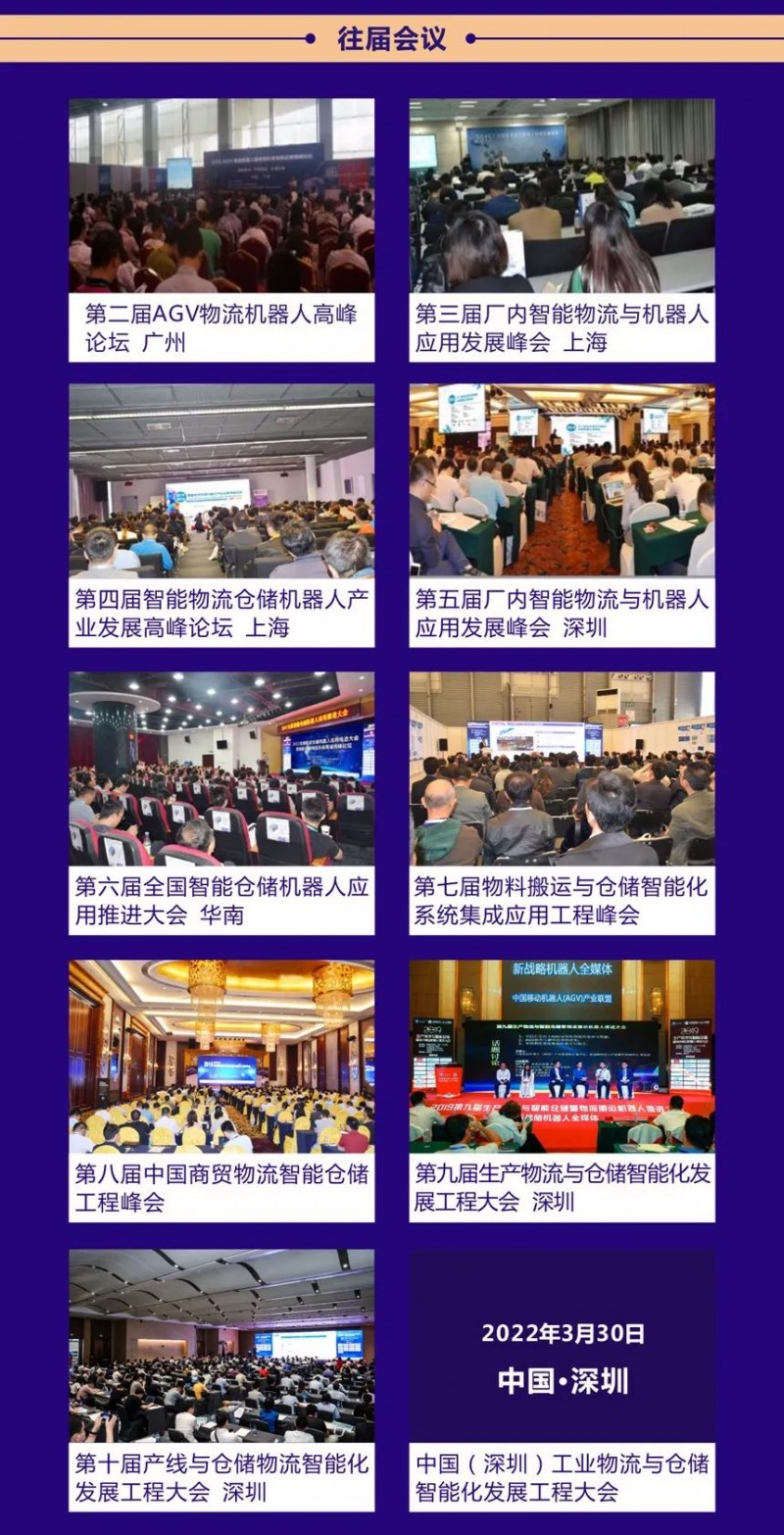 中國•深圳隨著我國社會經濟快速發展,生產要素也在不斷發生變化,人口紅利消退, 土地租金上漲,多重因素迫使 制造業企業加快轉型升級。工廠物流作為生產制造中的關鍵環節,制造型企業物流智能化、數字化轉型的需求日益旺盛。2022年,挑戰與機遇并存,因疫情影響,各種確定與不確定中,全球制造業物流移動機器人市場情況到底如何?未來將朝著什么樣的方向發展,產線物流及倉儲搬運對移動機器人有哪些新要求?4月13日,由中國移動機器人(AGV/AMR)產業聯盟將在深圳舉辦《中國(深圳)工業物流與倉儲智能化發展工程大會暨華南工業應用移動機器人推進大會》。中國移動機器人(AGV/AMR)產業聯盟,致力踐行制造業與物流業雙業融合,推動工業物流高質量發展。上游硬件設備:貨物包裝、智能立體倉庫、AGV自動搬運機器人、AMR自主移動機器人、無人配送機器人、碼垛機器人、RFID自動識別設備、堆垛機、輸送機、分揀機、無人叉車、無人機、智能快遞柜等;中游軟件系統:物流管理信息系統(LMIS)、智能倉庫管理系統(SWMS)、倉庫控制系統(WCS)、集成倉儲管理系統(IWMS)、制造執行系統(MES)等;下游應用行業:醫藥、汽車、新能源、鋰電池、3C、電子、零售、電商、冷鏈等。其他:物流周邊設備及配件、自動化包裝設備及材料、運動控制技術及產品、氣動液壓執行元件、齒輪傳動/減速機、軸承及傳動聯結件、產業園區等