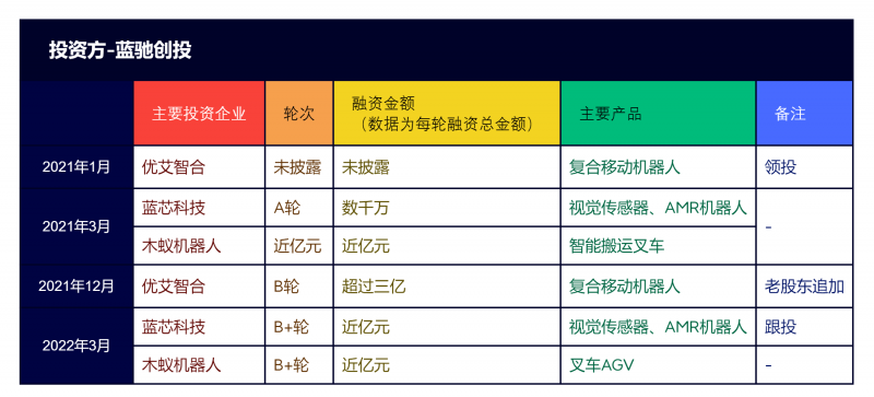 藍馳創(chuàng)投從2014年開始關(guān)注機器人賽道,近年來,藍馳創(chuàng)投在工業(yè)移動機器人行業(yè)內(nèi)投資企業(yè)包括優(yōu)艾智合、藍芯科技、木蟻機器人。