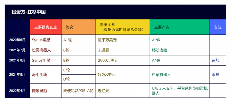 2020年以來,紅杉中國在工業(yè)應(yīng)用移動機器人行業(yè)中共參與了6起融資事件,被投企業(yè)主要產(chǎn)品覆蓋了移動機器人的移動底盤、無人叉車以及AMR等,企業(yè)專注市場領(lǐng)域從海內(nèi)囊括到海外,包括上文提及的“海歸”Syrius炬星、專注于“箱式倉儲機器人”的海柔創(chuàng)新,以及“移動底盤專家”松靈機器人和“打破傳統(tǒng)叉車固化設(shè)計”捷象靈越。