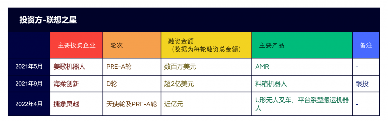 近兩年,聯(lián)想之星在工業(yè)移動機器人領(lǐng)域投資了三家企業(yè),包括箱式倉儲機器人科技企業(yè)海柔創(chuàng)新、機器人通用底盤松靈機器人、AMR機器人公司姜歌機器人,基本上都是從天使輪開始切入。